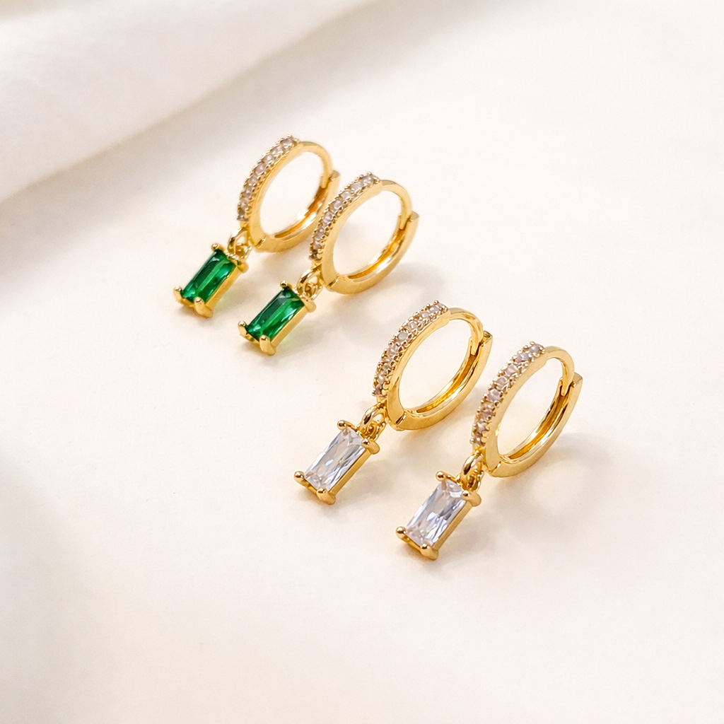Gold Emerald Green Baguette Drop Huggie Hoop Earrings For Women E150